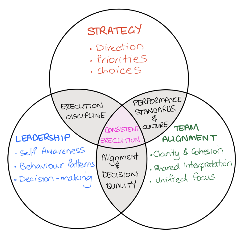 When one part of this system is stronger than the others, execution becomes uneven. Strategy may be clear, but alignment is inconsistent. Alignment may exist, but leadership behaviour under pressure disrupts it.